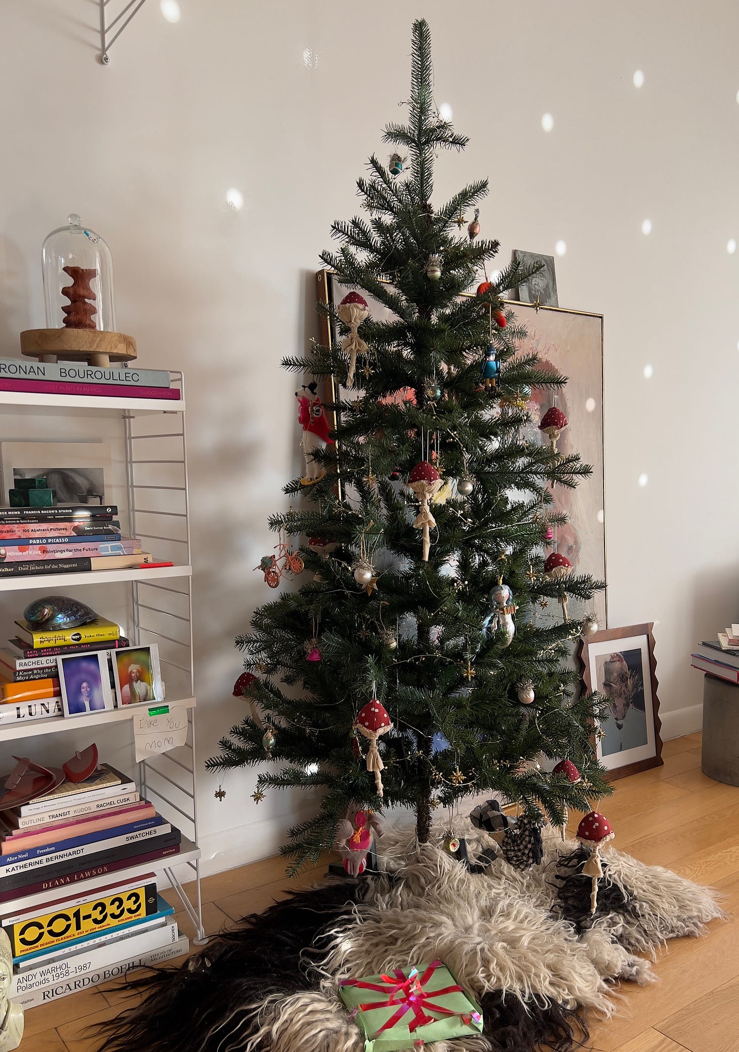 I had a vision: slim, restrained, almost architectural. The kind of tree that respects small apartments and doesn’t demand to be the loudest thing in the room. I even sent my husband out with a reference photo from my friend Alison of 600sqftandababy, whose small-space tree curation I admire every December. She has a gift for proportion and trees that feel intentional rather than imposed.
